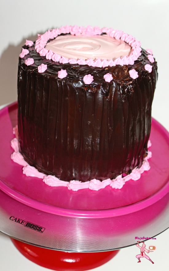 Among other tips, I learned both Buddy and his daughter are fans of the #4 and #16 cake decorating tips. (Pun intended! Sorry, I couldn’t resist.) Well, practice makes perfect: this Ninja Baker set out to place a few pink star flowers on her 3-layer chocolate cake. While I didn’t skimp on decorating time, I did engage in a few Ninja timesaving strategies.
