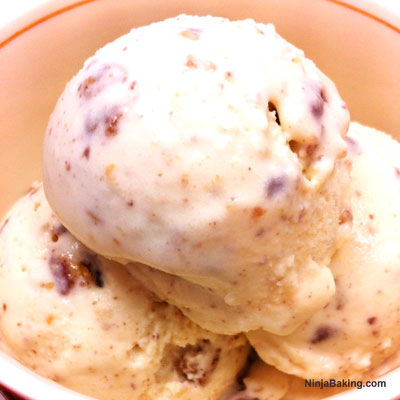 From the ice bath transfer the mixture in the freezer bag into your ice cream maker. Churn according to the manufacturer’s instructions. In the last few minutes, drop in the toasted pecans. Freeze in a parchment lined Tupperware bowl overnight.