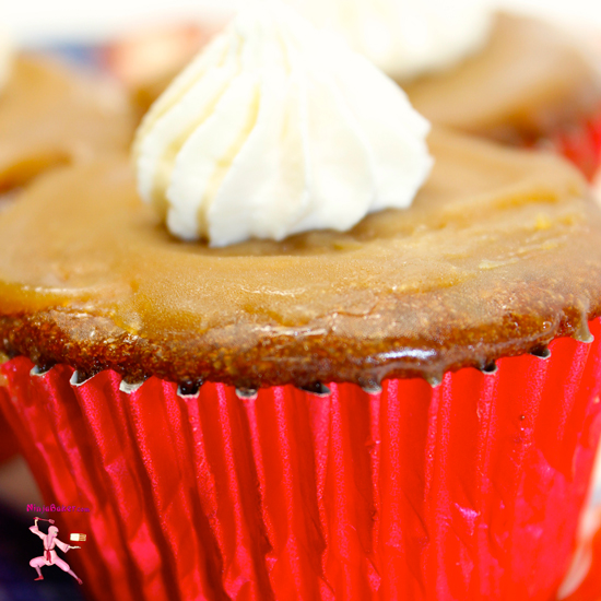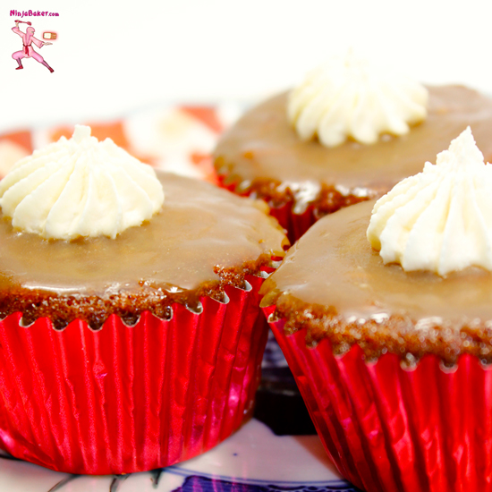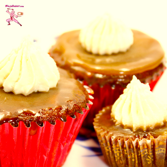Divide the batter among the cupcake cases. Bake in a 350 degree oven for 30 minutes or until a toothpick inserted into the centers comes out clean. Cool and drizzle with the caramel sauce.