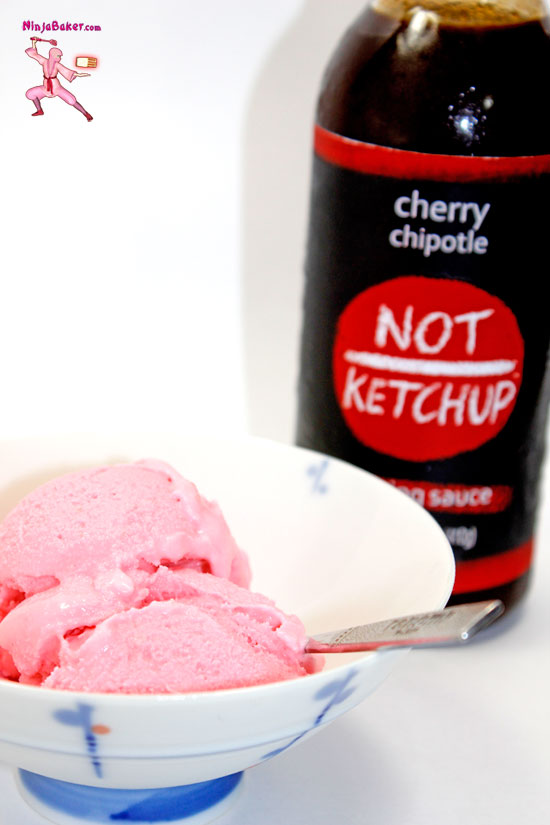This Ninja Baker had a vision of Not Ketchup Cherry Chipotle Brownies baking while Not Ketchup Cherry Chipotle Ice Cream churned. The result? As cherry chipotle ice cream touches the tongue, a distinct fresh cherry flavor emerges. Then an aftertaste of a smoky aged wine appears. (Perhaps from the apple cider vinegar in the Not Ketchup sauce.)