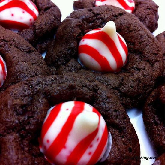 As soon as the cookies emerge from the oven, press an unwrapped Hershey candy cane kiss in the center of each one. If possible, cool before eating.