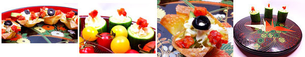 To showcase California and its Mexican influence, using Sandra Lee’s Crispy Wonton Cups recipe, I created Mini Tostadas: A bit of shredded lettuce, a slice of avocado, a dot of sour cream and a little black olive hat.