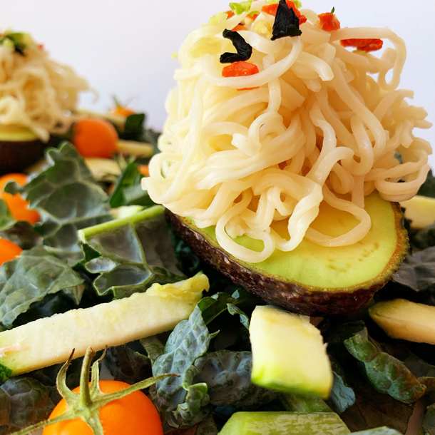 Similar to California, the health obsession has hit Japan. In my delightful Umai JapanCrate.com box, I discovered a Healthy Vegetable Ramen tagged Kenko (which means health in Japanese.) Since summer is sizzling in LA, I created a healthy California style ramen bento. Drained ramen arranged atop avocado and kale with assorted fresh veggies is scrumptious. The crunchy garnish put in the package by JapanCrate.com brings the bento to perfection. (Of course, the bento can serve as a plated supper for two.)