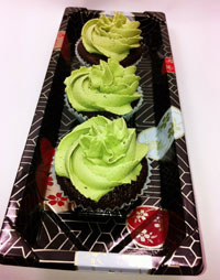 Pipe the matcha cream onto a mini cake. (If pressed for time, place the piping bag in the refrigerator. When decorating more cupcakes in the evening or a later time, if you have children, keep some cupcakes plain or sprinkle with powdered sugar. Not all kids are green tea fans. On the other hand, maybe this is a good time to expand their horizons.)