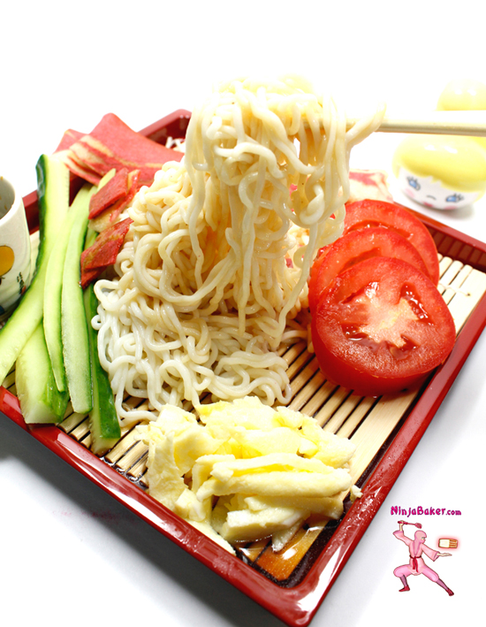 Silky low calorie shirataki noodles give way to crunchy, salty bacon. Cucumbers, tomatoes and Japanese omelet provide more fun for the palate. Fresh grated ginger in the soy-sesame dressing zaps the taste buds awake.