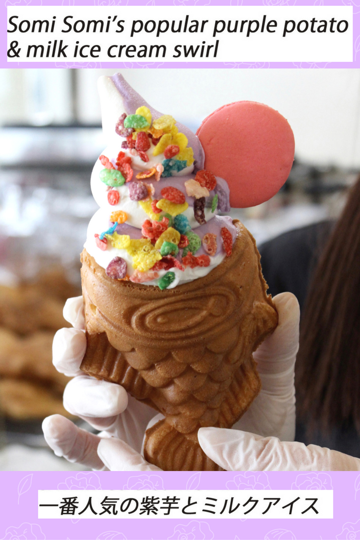 韓国街のSomi Somiというアイスクリームショップは、今はまだ無農薬の材料を使っていませんが、将来的に無農薬の材料を使いたいと言っています。ここのデザートはユニークで、おいしいですから、読者様に紹介したいとおもいます。開店してまだ六か月ですがもうとても評判がいい店になりました。色々なソーシャルメディアや雑誌に紹介され、とても評判がいい店になりました。アイスはトッピングがきれいだし、味はおいしいし流行っている理由がよくわかります。西洋と東洋の味と感覚を合わせていて、とてもおいしいです。トッピングにはアメリカのシリアル、オレオクッキー、フランスのマカロンなどを使っています。アイスのコーンはたい焼きの形をしていて韓国と日本の伝統を取り入れています。アイスクリームのフレーバーには抹茶、ゴマ、紫芋とミルクがあります。一番よく売れているものは紫芋とミルクです。 伝統的なたい焼きがお好きなかたには、伝統的なたい焼きだけをつくることもできます。ヌテラやカスタードをお好みの方はそれらの味を注文することもできます。韓流をお好みの方にこの店をお勧めします。