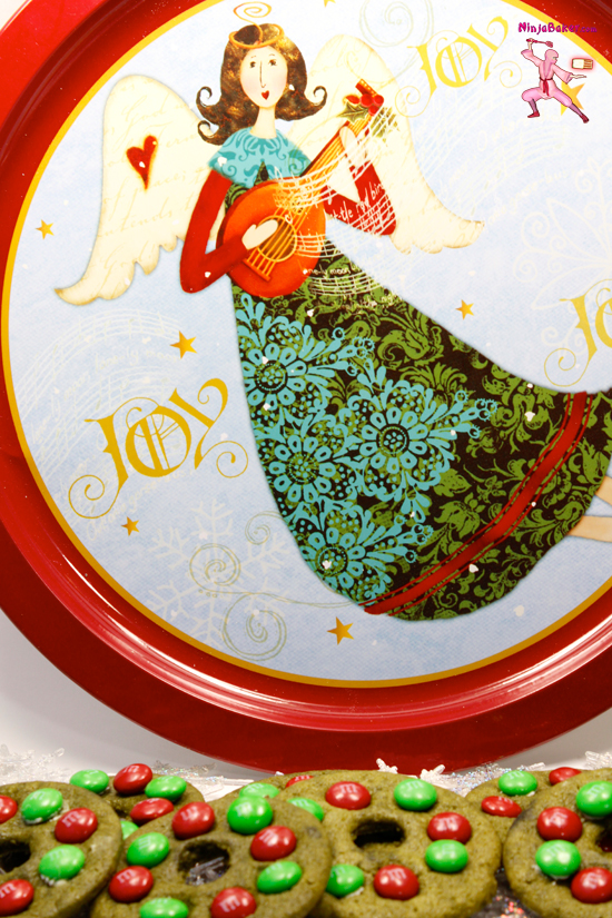 Ninja Note 3: Dot the wreaths with M & Ms as soon as possible. The cookies do firm up pretty quickly. (If they do, simply use frosting to stick the M & M chocolates onto the matcha cookie wreaths.)