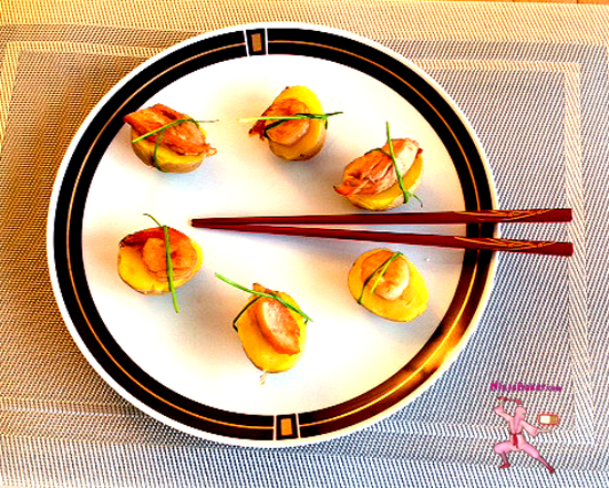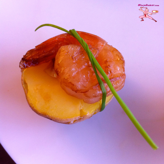 Slice the Yukon Golds in half. Place a slice of salmon or shrimp atop each half. Gently tie each Idaho® Potato Sushi with a chive leaf.