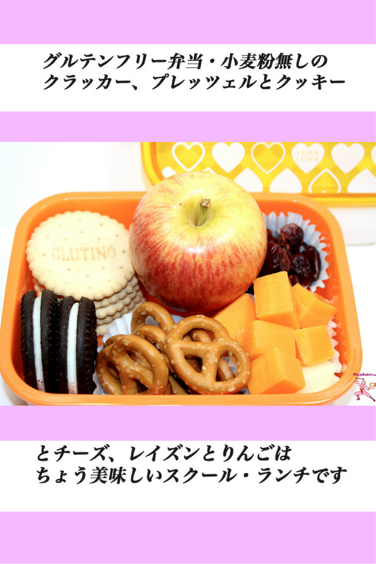 日本ではグルテンフリー(小麦粉を使わない食べ物)の人気が出始めているそうですね。それは欧米の影響かも知れません。アメリカでグルテンフリーの人気の理由は1970年頃遺伝子組み換え作物が始まり、急にアレルギーを持つ子供が増えてきました。それによって、モンサント(Monsanto)の様な会社は利益をえましたが、アメリカをはじめ他の国でも子供たちの健康は害されました。特に免疫系が弱くなりました。このブログではあまり政治的なことを書きたくないけれどもこの件は大事だと思いました。当時子供に安全な栄養を与えることは困難でしたが現在ではグルーティーノ(Glutino)のような小麦粉無しのクッキー、ケーキ、クラッカー、パンとプレッツェルを作るメーカーが出てきました。更に、家庭でパンとケーキを作りたい方のためにミックスを販売しております。幸運にもグルーティーノ から色々な美味しいものとミックスを頂きました。最近学校が又始まりましたのでグルテンフリーの弁当を作りました。この弁当中身はチイズ、クランベリーレーゾ、りんご、グルーティーノのグルテンフリークラッカー、プレッツェルとクッキーです。更に、子供が良い成績をとった場合、グルテンフリーのチョコオレンジのカップケーキを作りました。