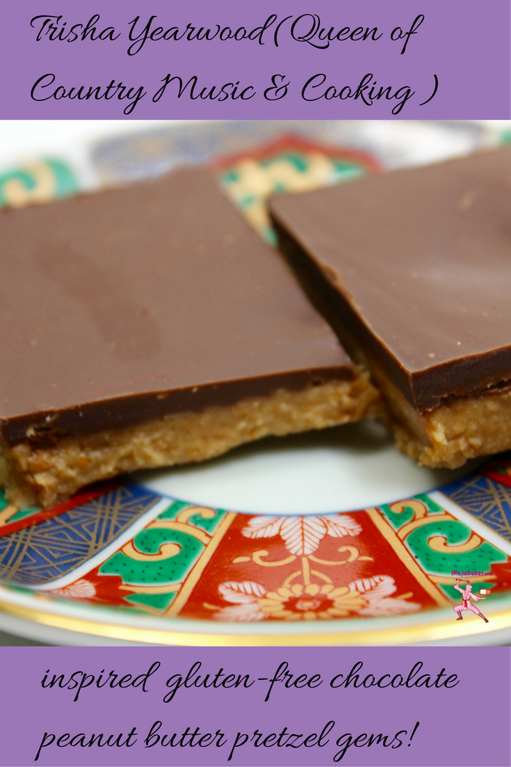 Inspired by the Queen of Country Music and the Food Network kitchen:Trisha Yearwood's chocolate peanut butter goodieis transformed into an irresistible gluten-free wonder. Melted chocolate hugs healthy peanut butter and gluten-free pretzels.