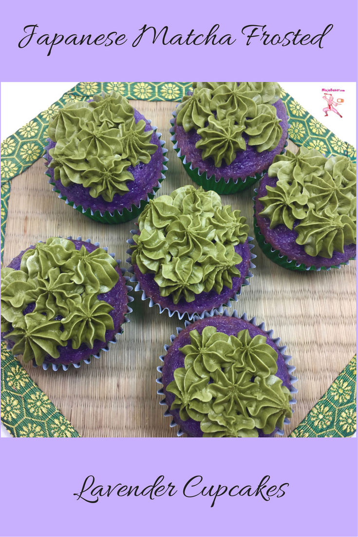 In Japanese cuisine, the look of a dish or dessert is tantamount to taste. The lavender hued cupcakes are indeed a lovely sight. The perfume of the cupcake also informs the palate in a very pleasant way! Bold matcha frosting compliments the light lavender cake.