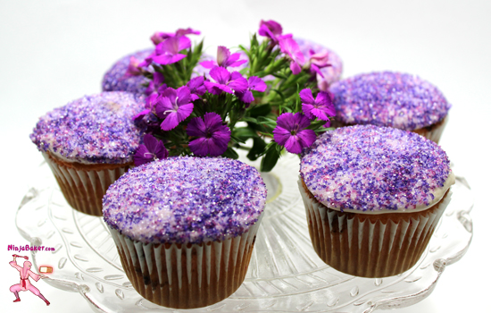 Slather the frosting on top of cooled cupcakes. Decorate with purple sprinkles.