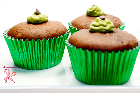 The low-fat chocolate milk in this cupcake keeps the cake light. Despite the double dosage of chocolate milk into chocolate cake mix, surprisingly the sponge is not tooth aching sweet. Strong green tea matcha cream adds a bitter but pleasant layer of contrast and yumminess!