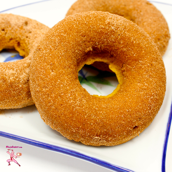 Enjoy the pumpkin donuts plain or dunked in cinnamon sugar. (½ cup sugar whisked together with cinnamon.)