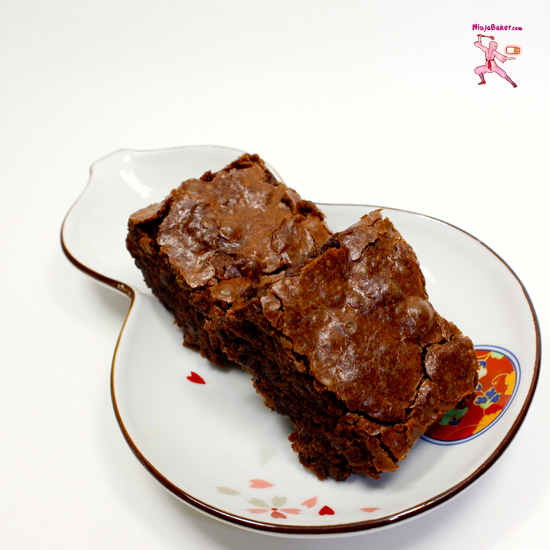 In another bowl, whisk together the eggs, sugars and extract. Stir in the chocolate butter mixture. Pour the chocolaty mixture into the flour blend. Combine well. (But don’t over mix! You don’t want tough brownies.)