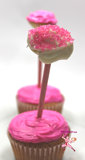 5. Handle the fragile Pocky biscuit sticks with care and dip into the melted candy melts. Sprinkle with pink sanding sugar. Or simply frost the cake pops with pink frosting.