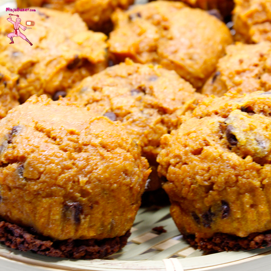 Pumpkin plays with chocolate miniature chips atop a chocolate Pocky crust. The muffin is soft, moist and a must-make for busy moms.