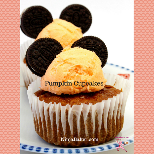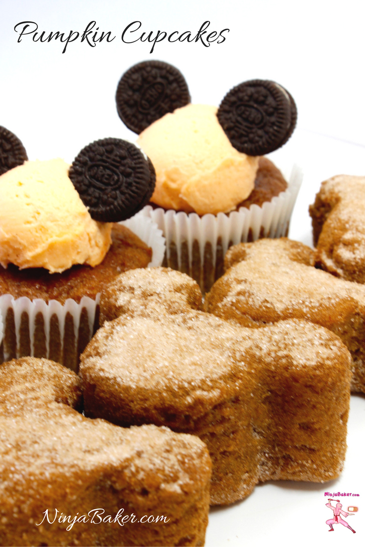 As all things pumpkin arrive with autumn, I join the pumpkin mania parade. Pumpkin Chocolate Cake, Pumpkin Chocolate Pocky Muffins and M & M Chocolate Pumpkin Loaf are but a few faves. Notice a penchant for chocolate pumpkin pairing? Today is no exception. Oreo Minis make perfect Mickey Mouse ears. Tucked into cream cheese frosting atop pumpkin cupcakes, the cookies make Disney magic appear.
