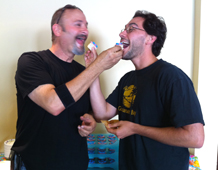 However, for non-decoration frosting, background color as it were, light not-so-sweet icings like Martha Stewart’s lavender-spiked variety is a perfect choice. Certainly, FOX TV’s Bones’ peerless prop people, Ian Scheibel and Andy Amicangelo (pictured above alongside a photo of the cupcakes) seemed to delight in my vanilla cake avec lavender, adorned with buttercream flowers.