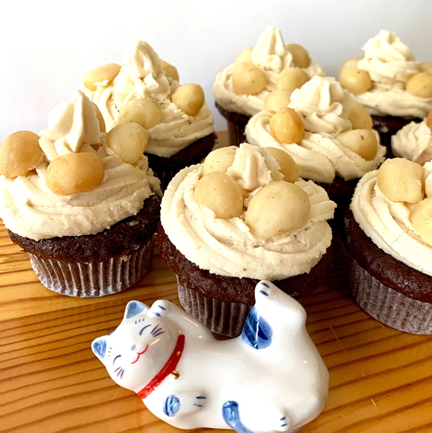 Before you leave Hawaii, besides chocolate covered macadamia nuts, be sure to pick up Hawaiian coffee butter. The Kona spread when mixed with powdered sugar transforms into luxurious buttercream. Atop chocolate mini cupcakes, you can wake up and smell the Hawaiian coffee…And know you are in Aloha paradise.